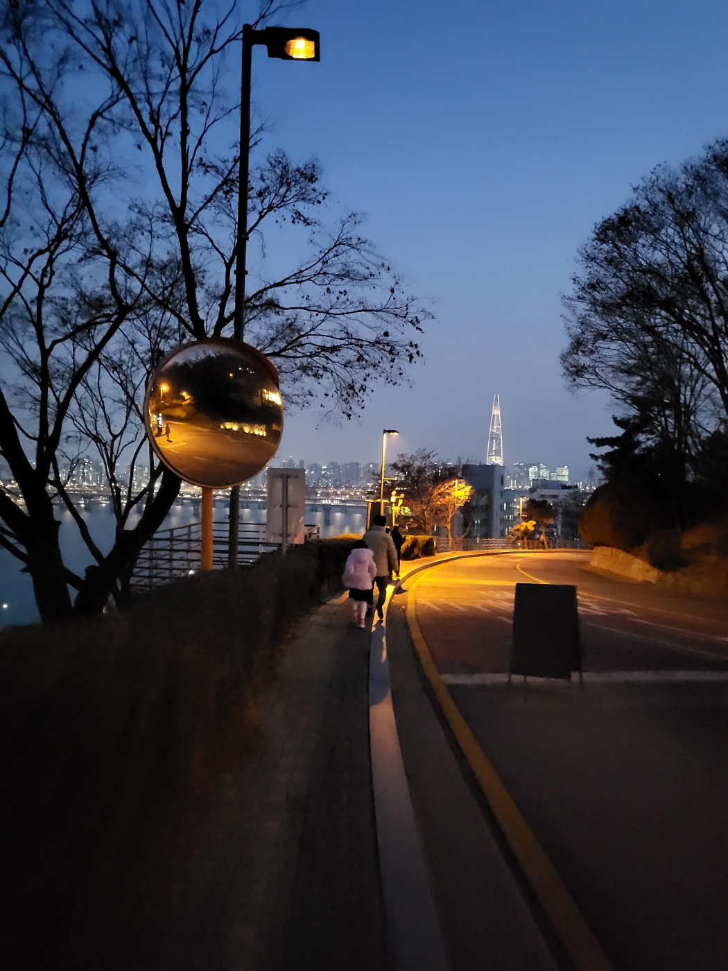지난번 딸과 짝꿍과 함께 그랜드 워커힐을 다녀왔습니다.김포에서 워커힐까지 거리가 멀긴 했지만 나들이 삼아 잘 다녀왔습니다. 워커힐에 체크인을 하고 저녁 식사를 하려고 나가다 보니 무료 셔틀버스 정거장이 있었습니다. 시간마다 무료 셔틀버스가 다녔습니다. 저희는 자가용을 끌고 가서 탈 일은 없었지만 다음 번에 자가용을 두고 온다면 버스를 타고 움직여도 생각되었습니다. 저녁 먹으러 나갈 때 한번 타볼까? 고민도 했지만 야경볼 겸 슬슬 언덕밑으로 걸어갔다가 걸어 올라오니 경치도 보고 좋았습니다. 파란하늘과 한강, 반짝이는 불빛들이 너무 예뻤습니다. 진짜 서울 야경 보는 거 좋아하는데 오랜만에 나들이 나와서 보니 더욱 더 좋았습니다.