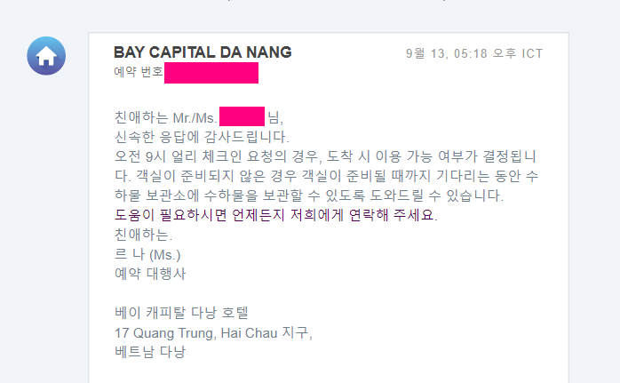 아고다를 통해 호텔측에서 보내준 메일 회신