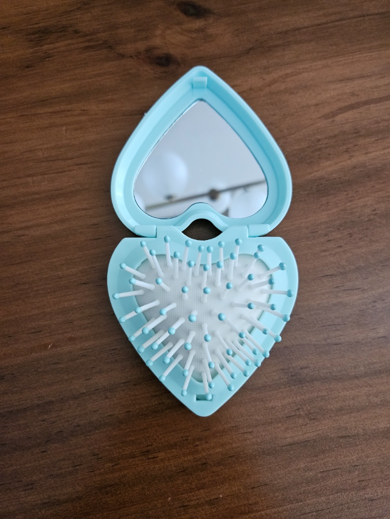 아이랑 저랑 머리가 길다 보니 평소에 들고 다니면서 쓸 빗이 필요했습니다. 아이도 이제 스스로 머리 빗는 걸 좋아하다 보니 빗을 사주니 좋아라 했습니다. 브러시 부분을 손으로 누르면 들어가고 나오고 해서 사용할 수 있습니다.그런데 새거라 그런지 조금 뻑뻑해서 손가락이 여러 번 끼었으니 참고하시기 바랍니다.  손바닥 사이즈라서 휴대하기는 편합니다.거울도 달려있는데 장난감 거울스럽지 않고 진짜 거울처럼 선명하게 잘 보여서 좋았습니다.