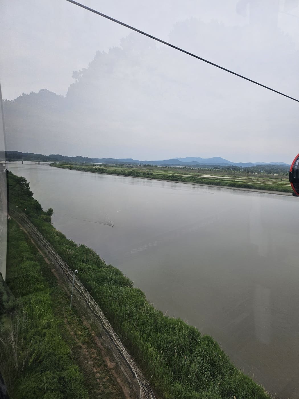 케이블카에 탑승하면서 가장 먼저 느껴지는 것은 임진강 위를 가로지르는 짜릿한 스릴감이 느껴졌습니다. 크리스탈 캐빈에 타서 그런 것 같아요. 곤돌라에서 영어, 한국어로 안내 방송이 나와서 들으면서 밖을 내다봤는데 강 너머로 보이는 풍경은 분단의 현실을 다시 한 번 상기시켜주는 듯 했어요.