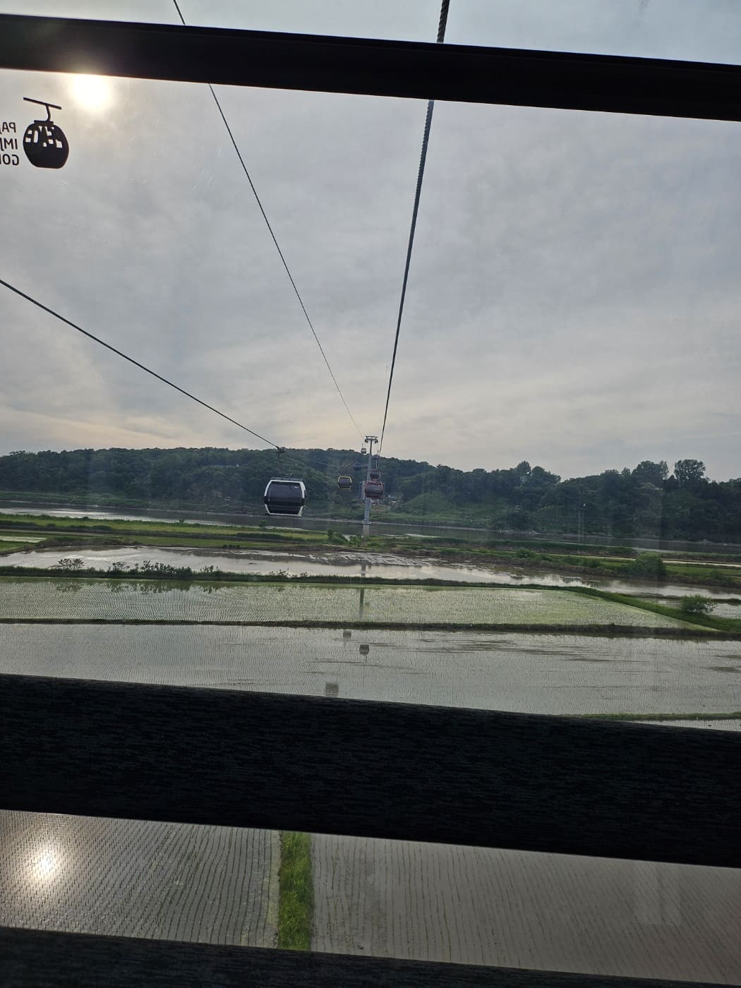케이블카는 바닥이 투명한 크리스탈 캐빈과 일반 캐빈으로 구성되어 있으며, 각각 10대씩 운행됩니다. 저희가 간 시간에는 거의 마감시간이 다되서 사람이 그렇게 많지는 않았어요. 붐비지 않아서 좋았어요. 아름다운 임진강 경관을 감상할 수 있으며, 날씨가 좋은 날에는 멀리 북한 개성공단과 송악산까지 볼 수도 있습니다. 상부 정류장에서는 캠프 그리브스와 제3땅굴 등의 안보 관광지를 방문할 수도 있어, 가족 단위의 관광객들에게 인기가 많다고 하네요:)