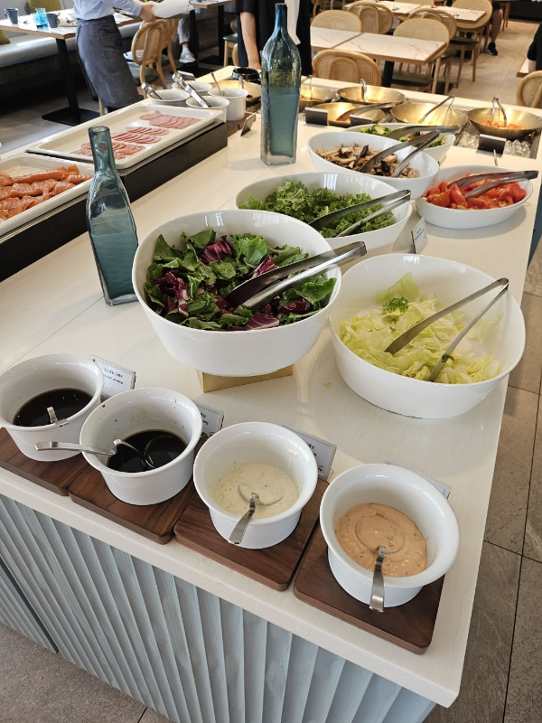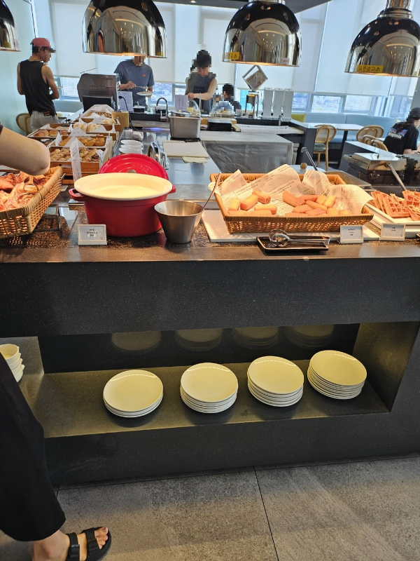 노보텔 엠베서더 동대문에는 20층에 있는 조식 푸드익스체인지와 1층 더델리 카페가 있어 고객들에게 다양한 식사와 음료를 제공하고 있어요. 20층 조식 푸드 익스체인지는 3부제로 운영하고 있어서 체크인 시 06:30-07:40 / 07:50-09:00 / 09:10-10:30 중에 예약해서 이용했어요. 늦은 시간으로 갈수록 대기가 좀 있을 수 있다고 하였는데 대기 거의 없이 들어가서 먹었습니다.식사 시간도 변경을 원하면 변경 가능하다고 합니다. 20층으로 식사하러 올라가면 객실번호를 이야기 하고 대기하다가 호실 부르면 입장하시면 되요! 1층 더델리카페 간 사진은 찍지 못해서 없네요! 저녁 타임에 가서 그런지 생각했던것 보다 빵이 많지는 않았어요. 저는 아인슈패너와 스콘을 샀는데 많이 부담스럽지 않은 가격내에서 이용할 수 있어서 좋았어요.