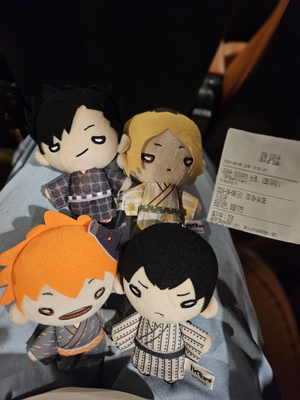 영화관 입장하니 저희처럼 하이큐 인형을 들고와서 관람표와 사진을 찍으시는 분이 있어요. 저희도 자리에 앉자마자 들고 간 하이큐 인형들과 관람표와 함께 인증샷을 찍었답니다! 제 최애는 카게야마 토비오 입니다♥