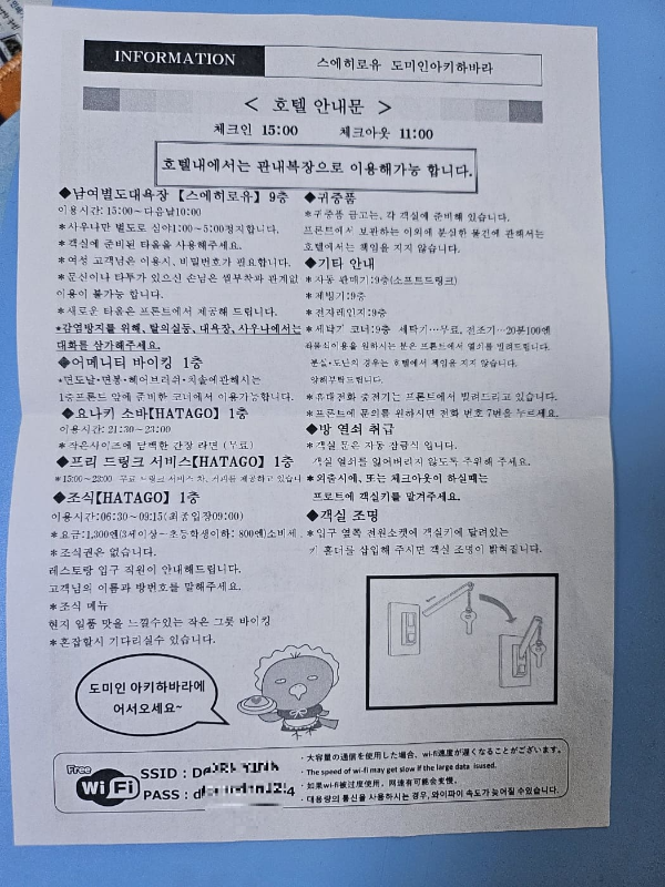 저희가 갈때는 아무래도 추운 겨울(?)인 2월이라..(조금 춥긴했어요) 1박에 13만원 줬던 것 같아요. 조식, 웰컴드링크, Wifi 등등 여러가지 포함된 가격이더라구요. 사실 호텔 가기 전에 아고다 통해서 미스난게 있어서 조금 언짢았었는데 막상 가니까 너무 좋더라구요. 후회없이 잘 다녀온 것 같아요. 대욕장에 무료아이스크림, 무료요구르트, 소바(이건 못먹었어요 항상 늦은 저녁을 먹고와서ㅠㅠ)맘에 드는 호텔입니다!