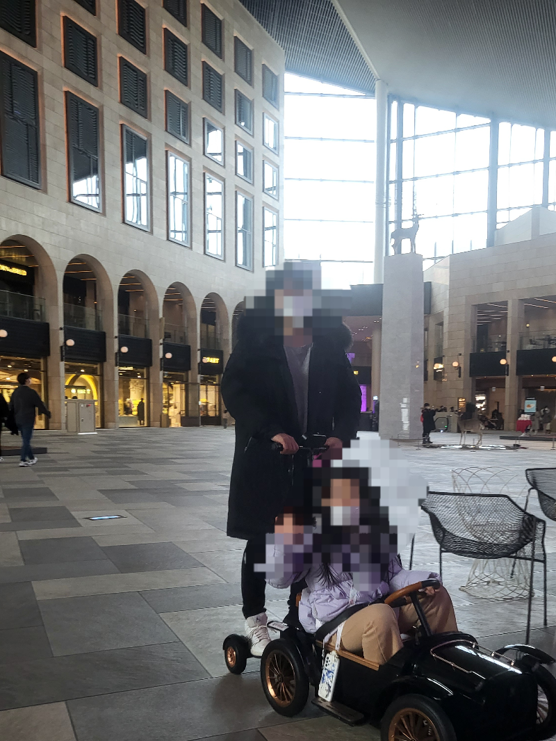 체크인 대기를 걸어두고 방문한 곳은 파라다이스 시티 광장이었습니다.블로그에서 봤던 전동 킥보드를 타보기로 했습니다. 사진으로 봤던 것만큼 넓어서 아이들이 뛰어놀기에도 좋아 보였고, 아까 체크인하는 곳과 달리 북적이는 느낌이 들지않아 더욱 더 좋았습니다. 조금 아쉬운 점은 쇼핑공간이 많이 없다는 것이었습니다.기념일인 만큼 쇼핑을 하려고 했는데 그러지 못할 것 같다는 게 아쉬웠습니다. 전동킥보드는 가격이 아마 짝꿍이 이야기하길 30분당 1만 원이라고 했던 것 같습니다. 기억이 가물가물하여 대략적인 금액만 공유해드립니다. 아이가 이거 너무 재밌어해서 다음날 또 탔습니다.